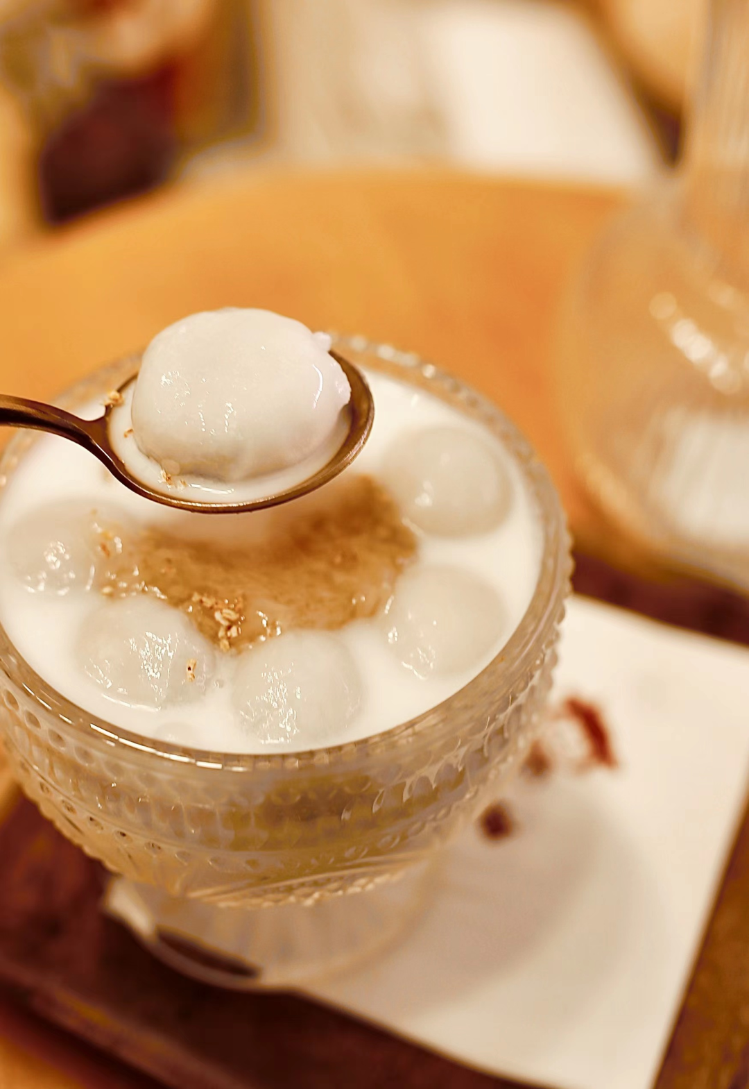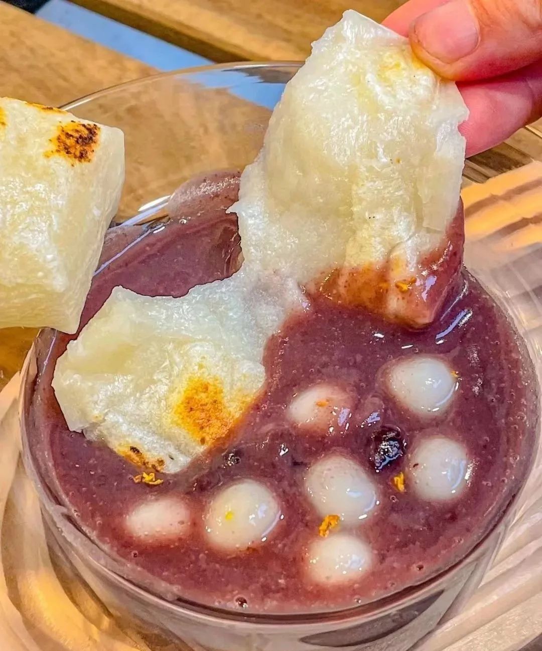 小浪花记得小时候,冬至之时是要吃汤圆的,也叫“冬至圆”。圆润可爱的汤圆浮在透白的酒酿汤里,是属于冬至的小确幸呀! 牛奶冰沙打底+可爱白皙软乎乎的大团子+酒酿+桂花碎,冰冰凉凉的口感,不喜甜星人还可以备注调整甜度。 另外,一可的招牌红豆年糕汤里面也可以加小汤圆。屋外寒风四起,屋内用上一碗绵密热乎的红豆沙简直不要太暖和通透。