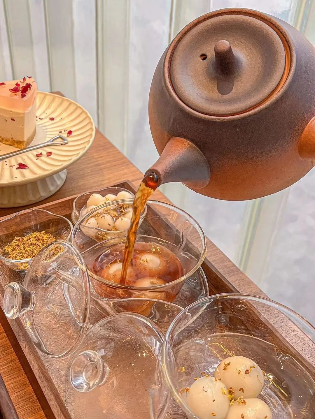 万象城的「糖站楼」是一家新中式下午茶,去年元宵节推出了团团圆圆系列,其中一款是陈皮入普洱煮茶,茶食配汤圆和桂花。名字很特别,叫做「大郎喝药套餐」。黑芝麻馅的汤圆浸润在普洱茶里,一边补充能量一边刮油!糖站楼·Terminal Sugar(万象城店)