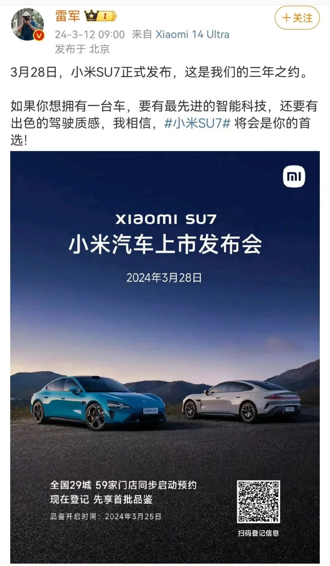 “从2021年3月30日官宣造车开始,‘2024年上半年上市’的三年之约,每天都记在我心里”,小米集团创始人、董事长兼CEO雷军在社交平台上表示,如果你想拥有一台车,希望有最先进的智能科技,还有优秀的驾驶质感,小米SU7会是你心仪之选。