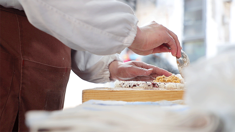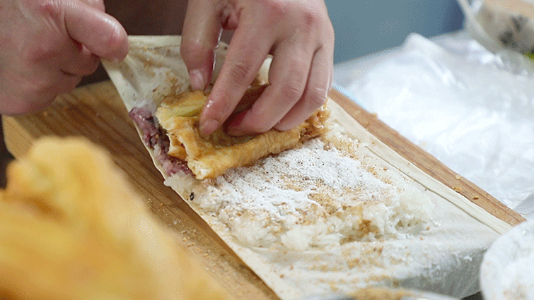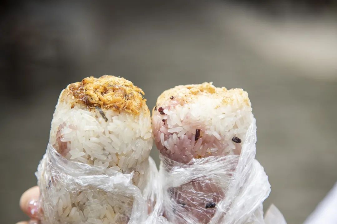 与先有甜粽后有咸肉粽一样,咸口糯米包油条也是后来才有的。白糖、黄豆粉这些配角被换成了海苔或肉松,肉松本就和软乎乎的糯米十分相配,再裹上一张海苔,鲜味儿也来锦上添花了。
