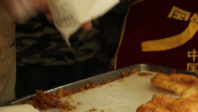做油饼包烧麦的师傅都是“无情铁手”,同时讲究“唯快不破”。先将刚从油锅中捞出来的油饼用铁铲划开个口子,再迅速将烧麦塞入其中,全程不过十来秒。不快不行,会被烫到。