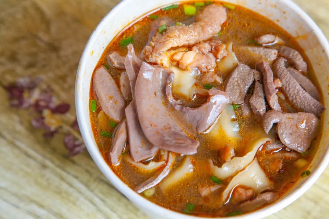 生烫,就是将新鲜的肉类汆水烫熟佐粉面,一般有牛肉、牛杂、猪肝和腰花等。所谓“高端的食材只需要最简单的烹饪方式”,新鲜的肉类在滚烫的高汤里修行十来秒,褪了红就算是好了。