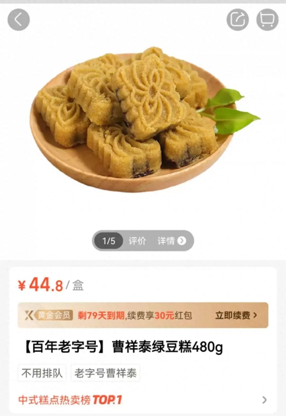 记者注意到,在盒马购买曹祥泰绿豆糕,一份480克的产品,售价是44.8元,可以免去排队的时间,还能享受送到家的服务。不过,这个价格比曹祥泰门店售价略高一些,但使用盒马X会员的折后价与曹祥泰门店持平。