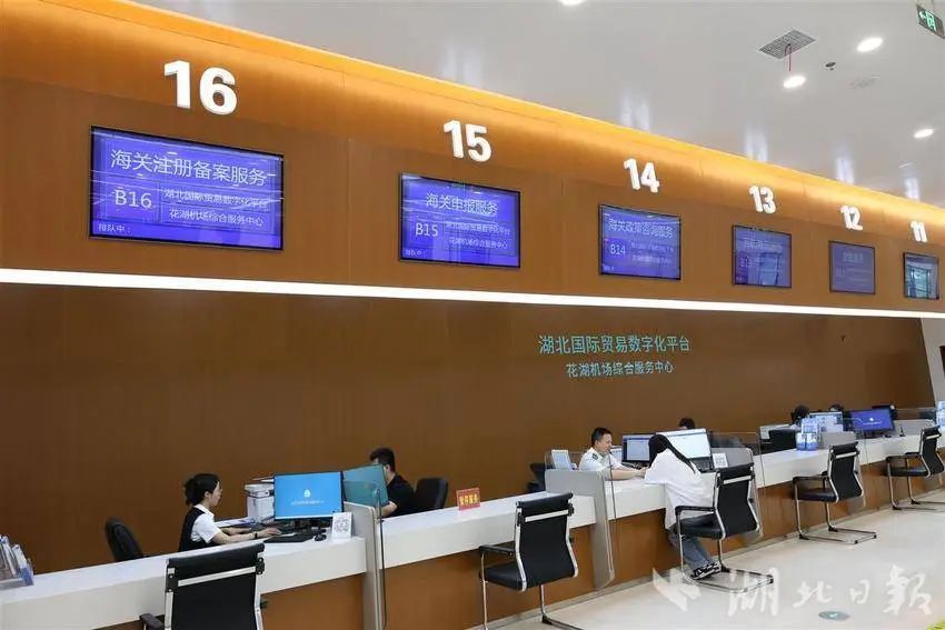 在临空经济区政务服务中心显示屏上,实时滚动播放航班信息、国际出港舱单位重量统计、国际出港票数统计等。临空经济区口岸和投资促进局局长李丽介绍,前来办理进出口业务的企业代表,只需轻触屏幕,便可了解花湖国际机场的航班动态、关务超市、智能辅导及供应链等可视化服务,通过“指尖或者键盘”便可完成通关等业务。