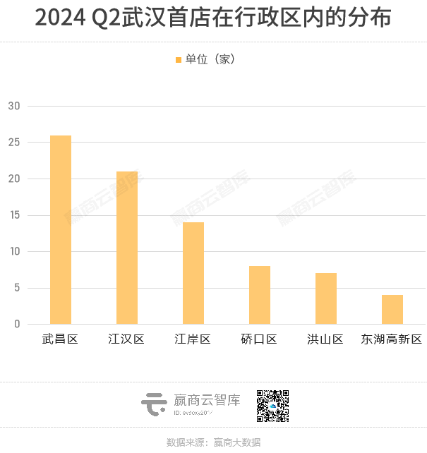 3 分行政区划看:武昌、江汉、江岸、硚口、洪山和东湖高新6区有首店进驻,其中武昌区和江汉区首店数量均超过20家;