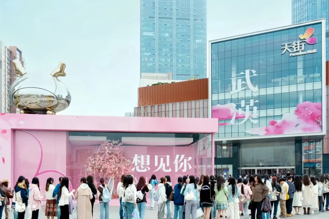 如今年初结合武汉三月樱花季,推出的「想见你」美陈盒子,加入专属武汉的樱花符号,更符合城市文化特色;而年内持续推出的主题活动,如东方韵味的天街庙会、国色当道的艺术展览等,都为项目增添了感性的「文化磁力」。