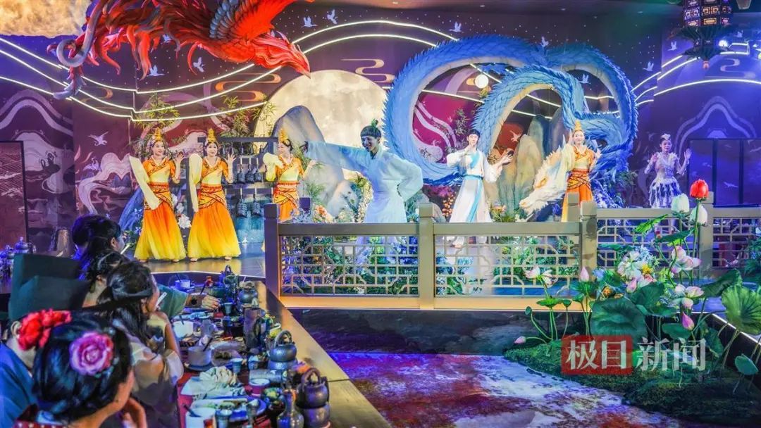 发布日期:2024-08-05 09:01:51 文章来源:武汉商务在同一消费空间里,可以一边欣赏歌舞、一边品尝美食,是不是视觉与味觉的双重体验?近日,湖北首家“餐饮+剧场”模式的酒店开始试营业,店里每一位食客都换上了汉服和古风装扮,在古色古香的剧场里一边欣赏楚文化表演,一边品尝湖北地道美食。