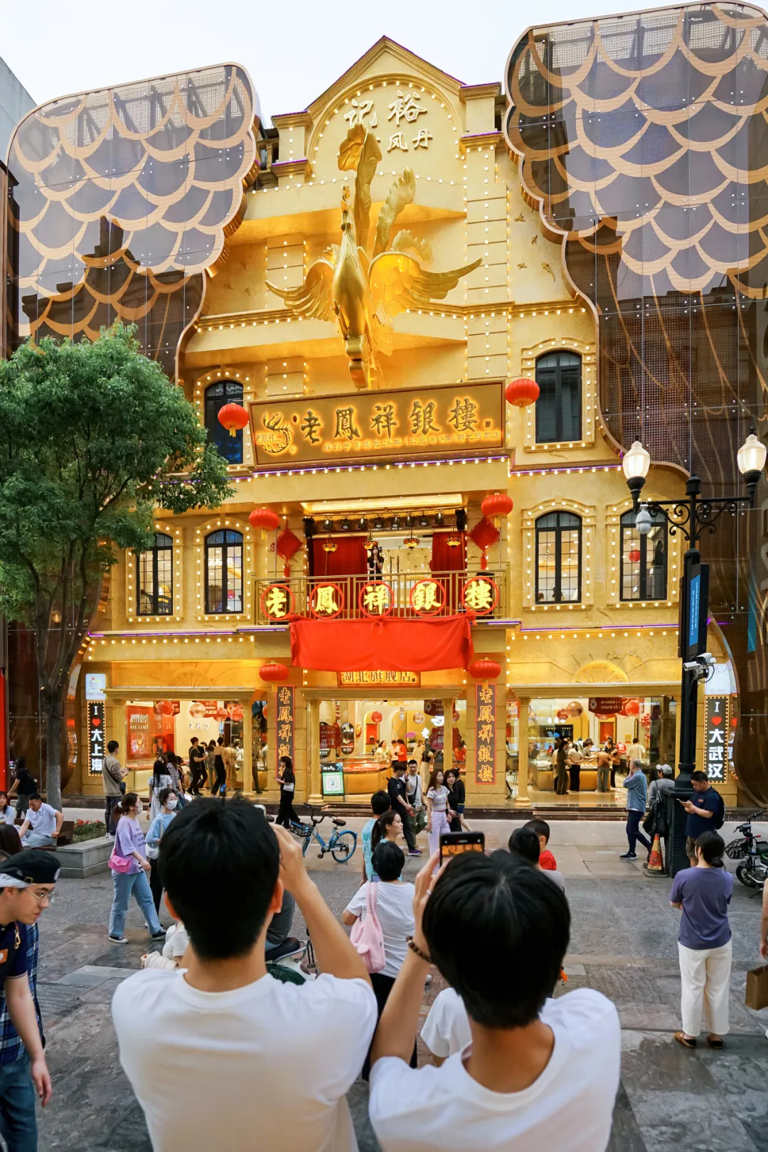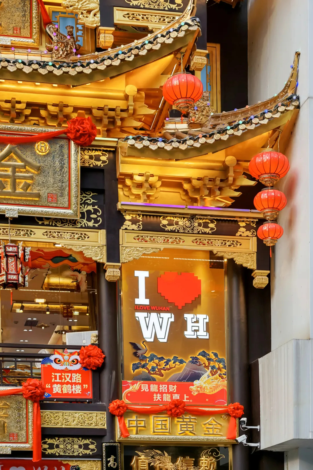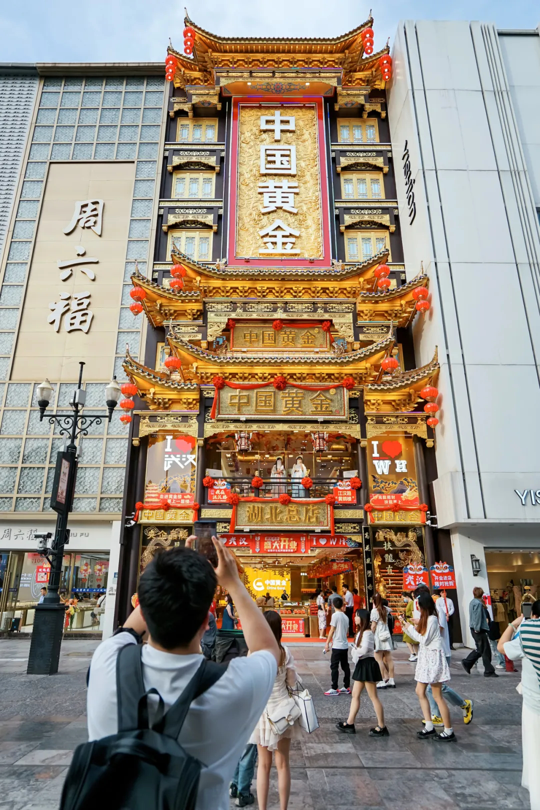 与江汉路上的民国建筑风不同,中国黄金湖北总店采用传统民族建筑的飞檐翘角,如宫殿般辉煌的黄金楼在阳光下发出金灿灿的光芒,熠熠生辉、十分抢眼,引得不少路人驻足观看,拍照打卡。