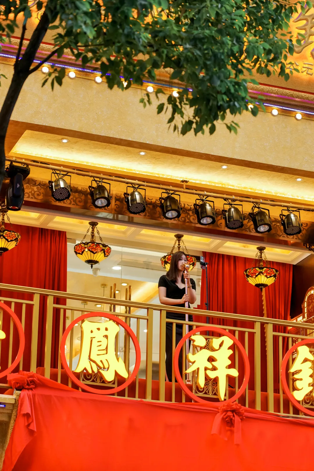 两位黄金巨头的双双出圈,还都在二楼露台都设置了助兴的表演环节,中国黄金以舞蹈等节目为主,老凤祥则以身着礼服驻台唱歌为主。