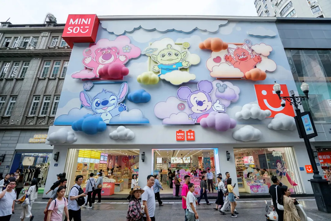 还有近年来被称为“联名大佬”的名创优品武汉城市形象店,招牌上排列了草莓熊、史迪仔等热门ip的立体形象,摆出诚迎各位公主回迪士尼的姿势,加上多巴胺的配色,萌到没朋友!