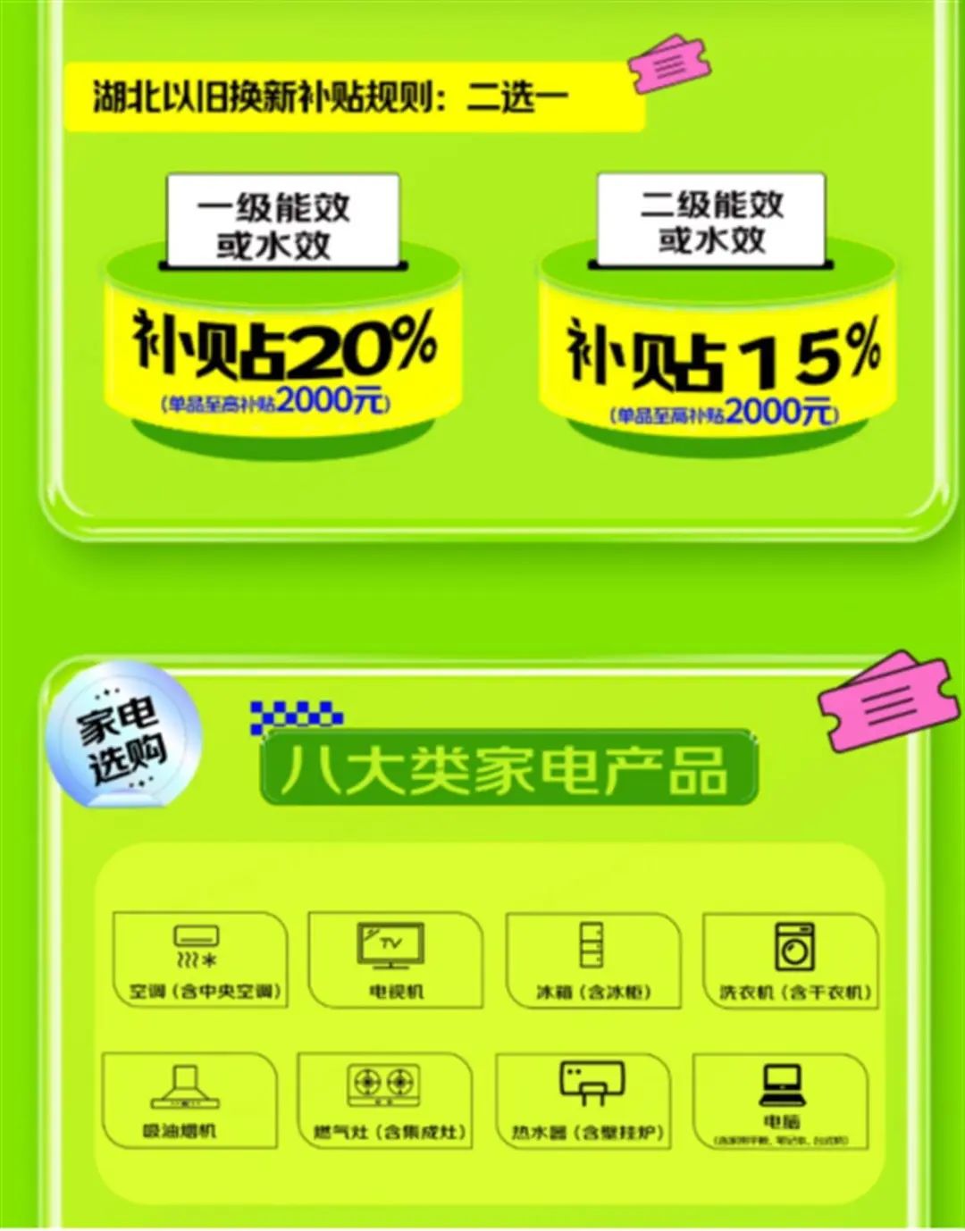 依据国家发展改革委、财政部7月25日发布的《关于加力支持大规模设备更新和消费品以旧换新的若干措施》,湖北省商务厅自即日起至12月31日,开展家电以旧换新活动。此次活动覆盖空调、冰箱、洗衣机、电视机、吸油烟机、燃气灶、热水器、电脑等八大类产品,一级能效/水效家电享受20%的补贴,二级能效/水效家电享受15%的补贴。