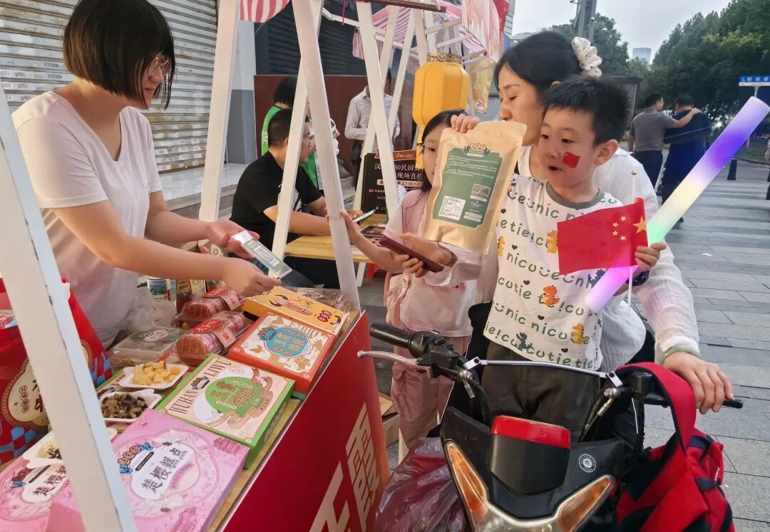 民俗互动区域成为活动现场的消费热点。百年非遗“汪玉霞”展区陈列着精美的苏式月饼,并开放免费品尝,香甜的气息吸引居民排队领取,在味蕾享受中感受非遗魅力的同时,不少居民现场下单购买月饼礼盒,助力老字号品牌实现“体验式消费”转化。“格蕾摩尔(汉口1930)”展区通过复原民国汉口场景,以老式留声机和复古陈设唤起人们的怀旧情怀。灯谜区设置了“中秋民俗”“民族知识”等主题谜题,答对者可获赠民族风文创礼品,有效提升互动性和参与度。广场上的“家国文化打卡区”同样人气旺盛,居民在国旗和灯笼背景下拍摄全家福,打卡热度直接拉动周边商业综合体的餐饮、服饰等消费。