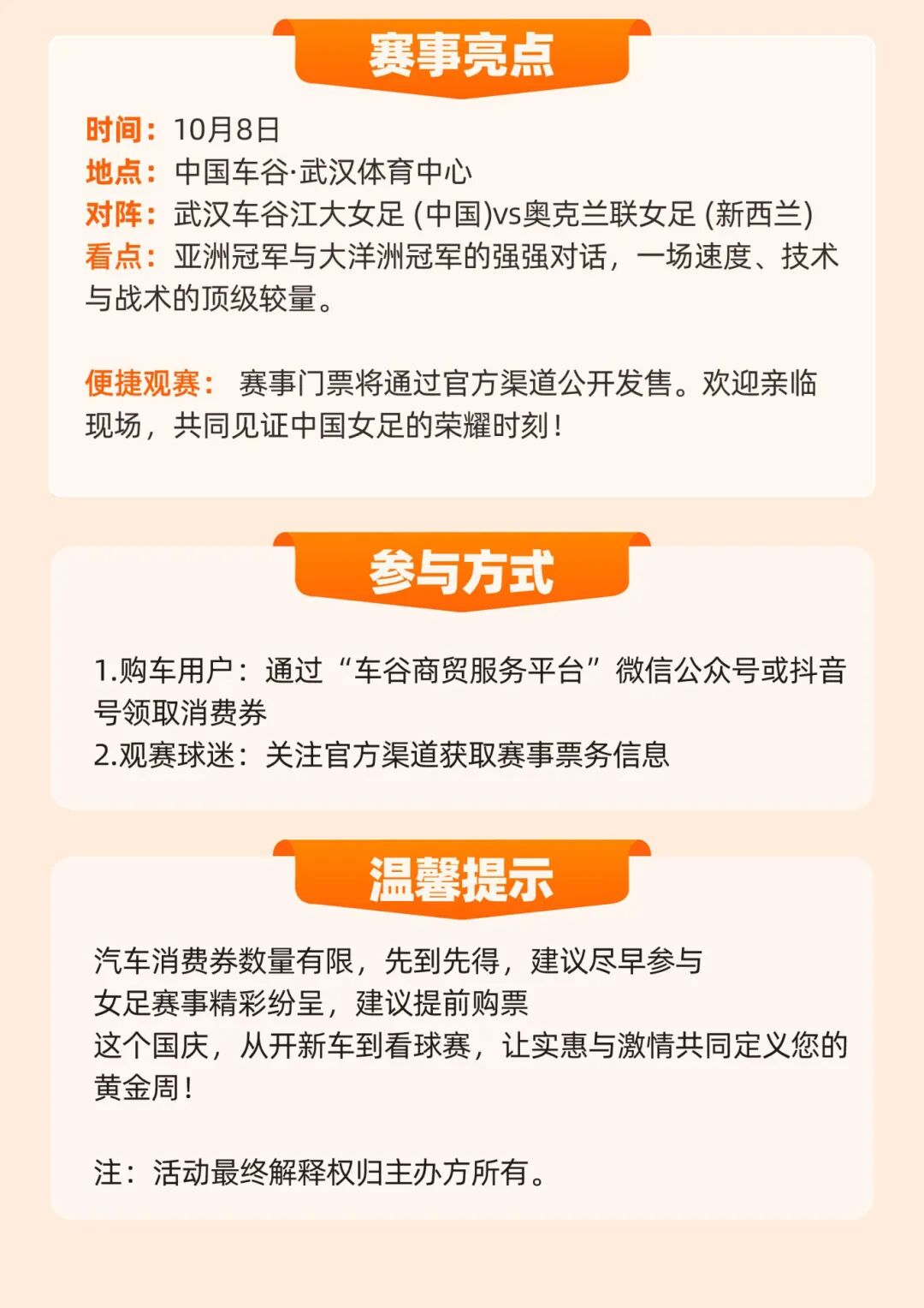 ,中国车谷品牌运营中心汽车消费黄金周全省让利,更有首届国际足联女足冠军杯压轴登场。优惠购车与顶级赛事,点亮您的精彩假期!