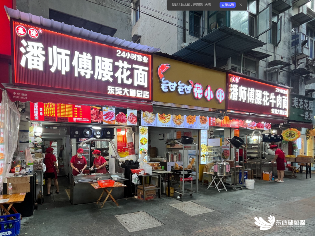 有意思的是,它的扩张带着点老街特有的随意感——新店与老店中间还夹着一家花甲小店,食客们穿行其间,左手拎着潘师傅打包的面,右手可能就顺带捎上一份隔壁的花甲,倒成了东吴大道一道独特的风景线。