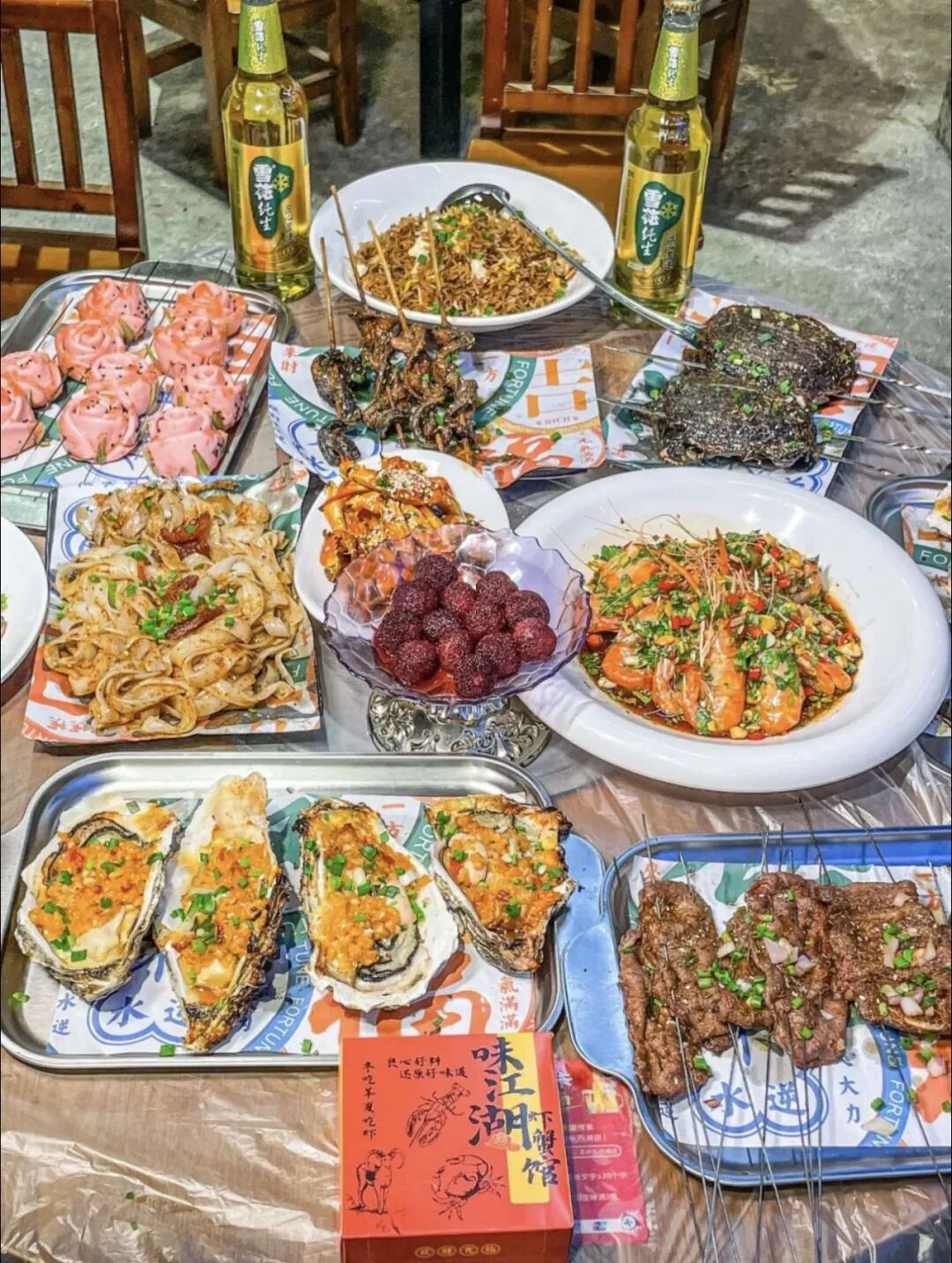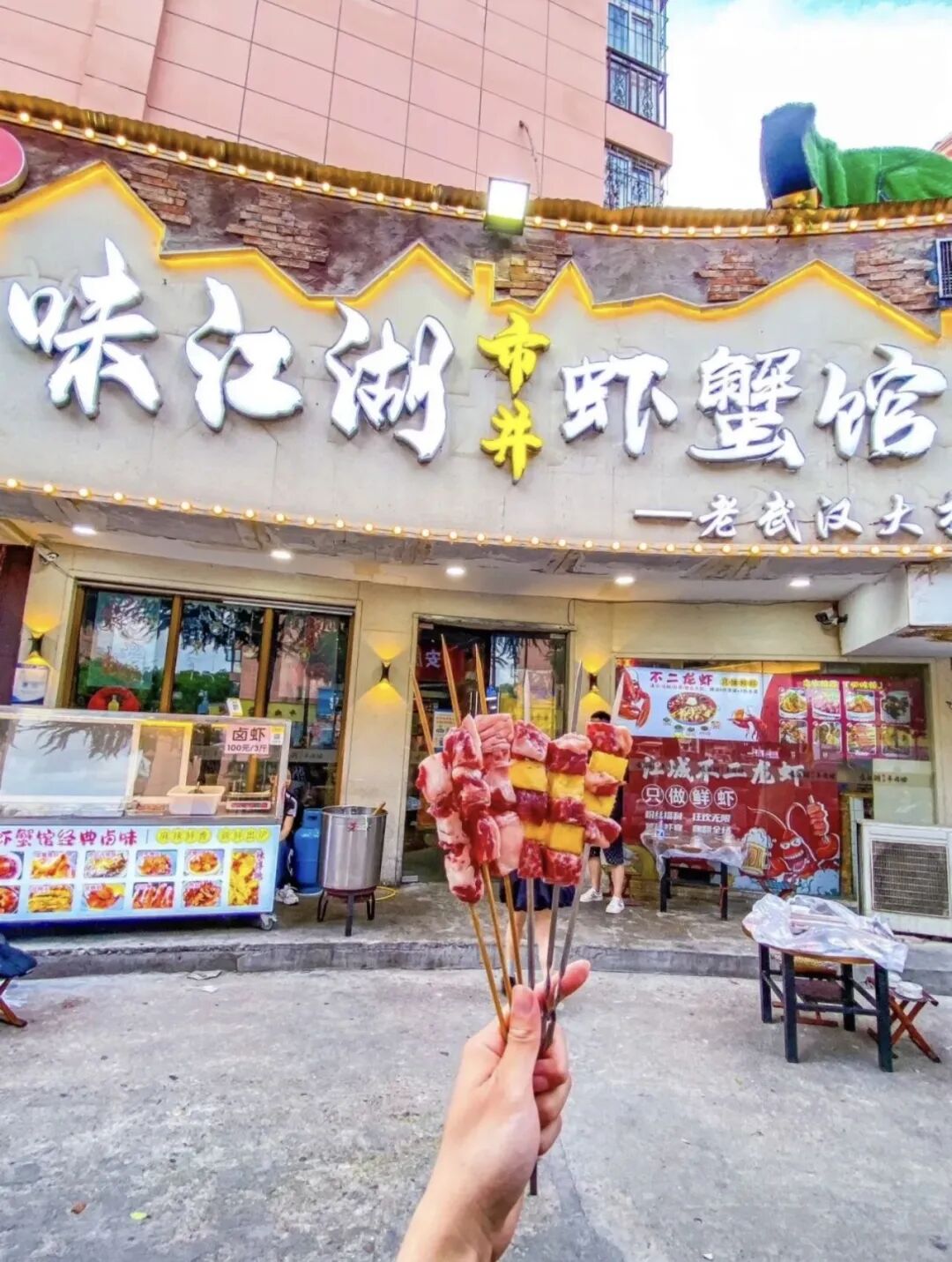 老板老陈,四十出头,2018年,他和朋友合伙开了家“凤爪王烧烤”,可没多久,合伙人抽身离去,只剩老陈独自撑起这片天地。他大刀阔斧地改革,摘下旧招牌,挥笔写下“味江湖市井虾蟹馆”——冬天,鲜嫩的羊肉在锅中翻滚;夏天,活蹦的虾蟹成了主角。老陈的江湖里,从不缺新奇:东西湖第一家做卤虾的馆子,头一个用澳洲雪花和牛烤串的摊档……每一次创新,都像在烟火气中投下一颗石子,激起老饕们的阵阵涟漪。