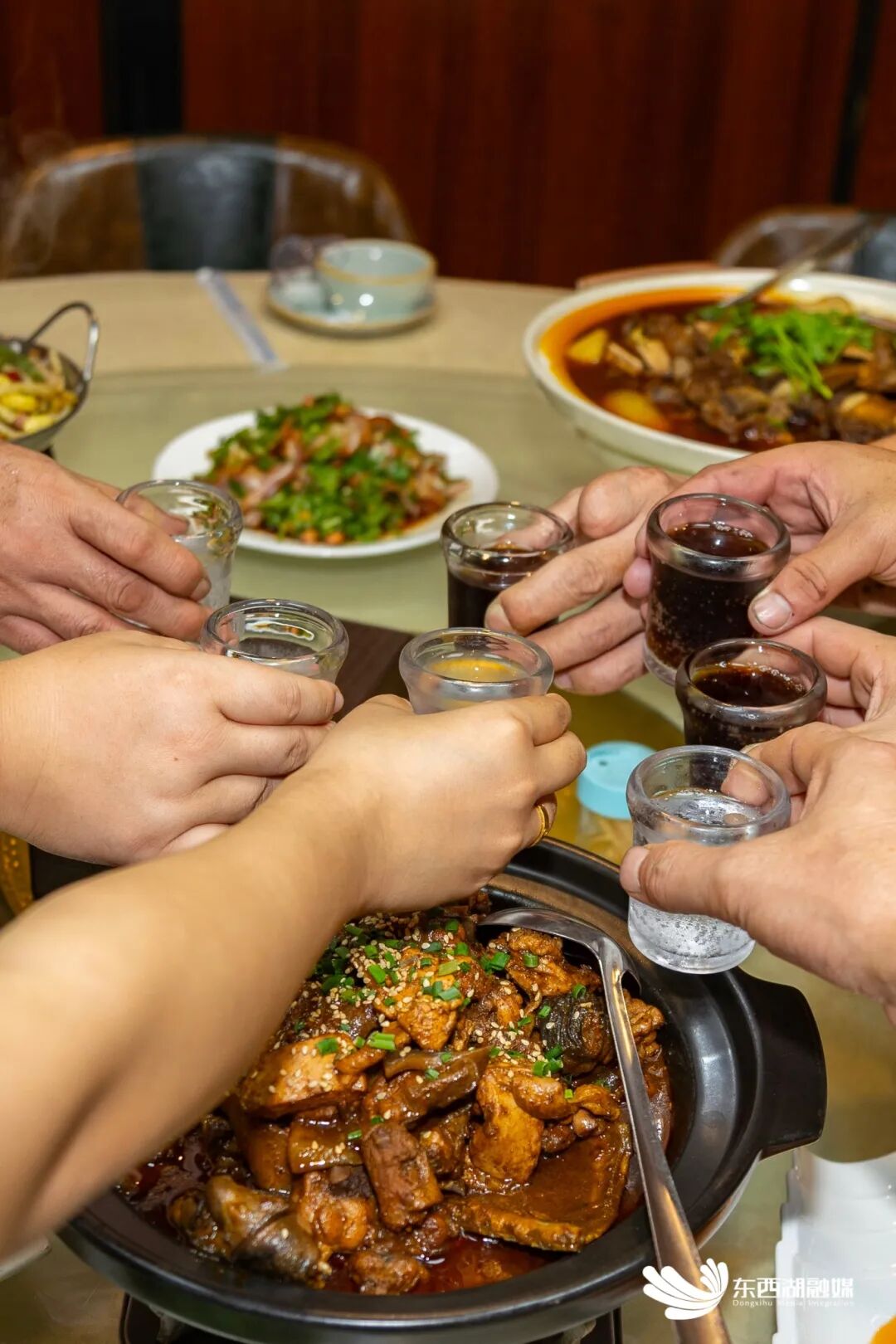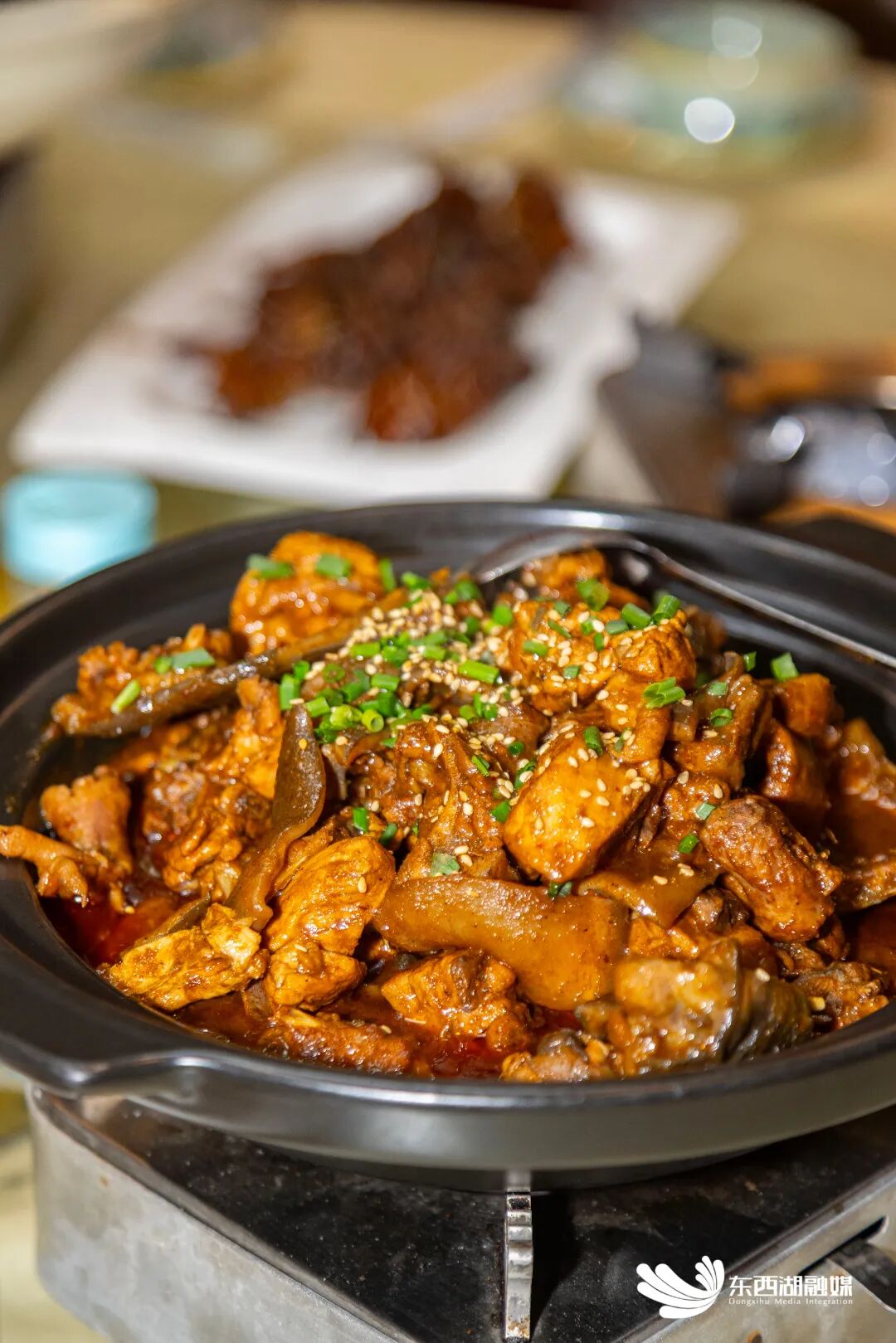 后厨里,甲鱼锅用文火慢煨。汤底醇厚,泛着微微辣意。最诱人的是晶莹肥厚的裙边,胶质饱满,入口腴嫩。这是湖北菜系中的“水八珍”,《随园食单》赞其“生炒腴嫩,酱炒鲜香”。这里的做法更重细节,可牢牢锁住湖塘的鲜香。