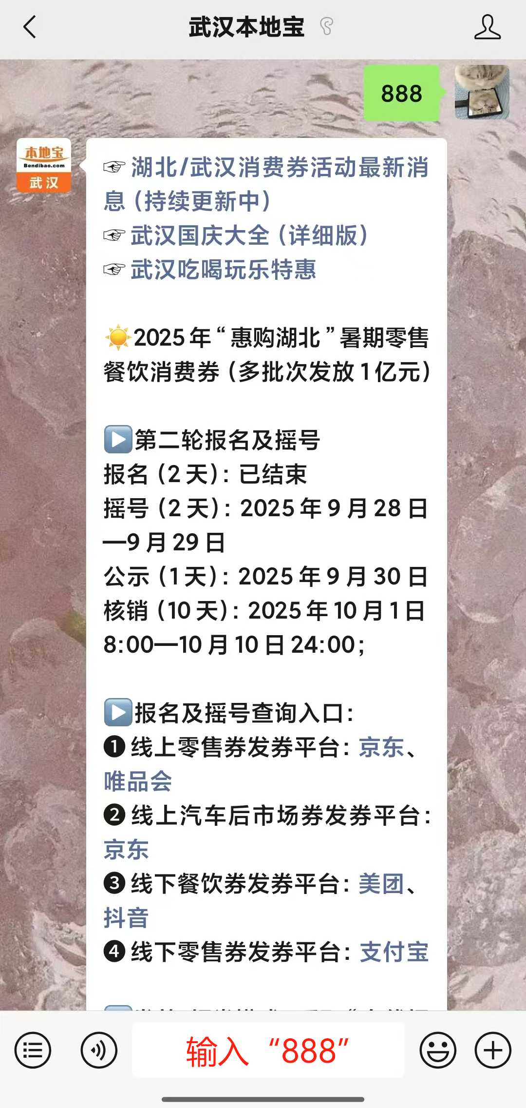 小编推荐:大家可前往唯品会、京东、支付宝、美团、抖音平台使用,也可以扫描下方二维码,关注【武汉本地宝】微信公众号,在聊天页面回复【888】即可获取消费券使用方法、第三轮消费券报名入口等信息!