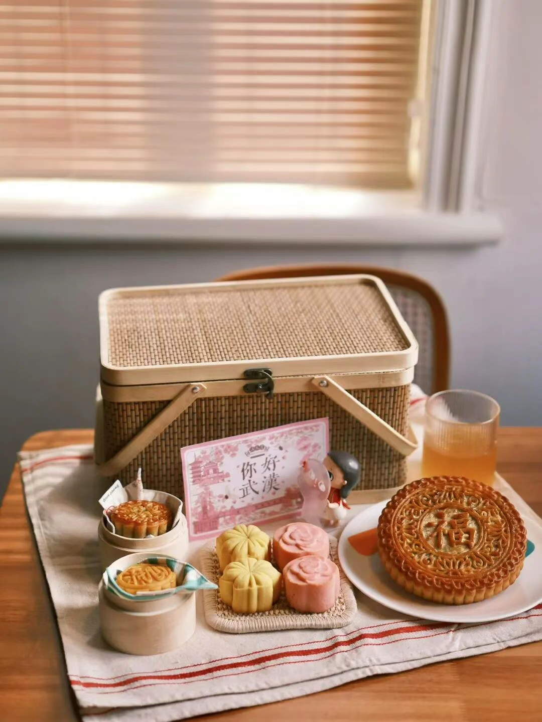 这些创新,从来不是对传统的颠覆,而是对生活的适配。就像汪玉霞的中秋礼盒,既有“金秋映月”“花开富贵”等传统中式设计,印着 “武汉礼物”的字样,适合送给长辈;也有国潮插画主题的礼盒,用墨绿、湖蓝等颜色搭配烫金工艺,年轻人们喜欢买来送给朋友,既体面又有本土特色。