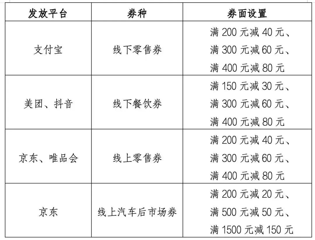 线上零售券:仅限于在电商平台自营商铺中粮油食品、服装鞋帽、报刊图书、母婴产品、美妆护肤、户外运动、医疗保健等商品(不含电子产品、家电、家具家装、电动自行车)。发放平台为京东、唯品会。