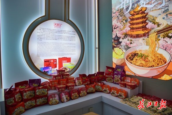 大汉口热干面系列产品码放在湖北展区内。 记者史伟 摄