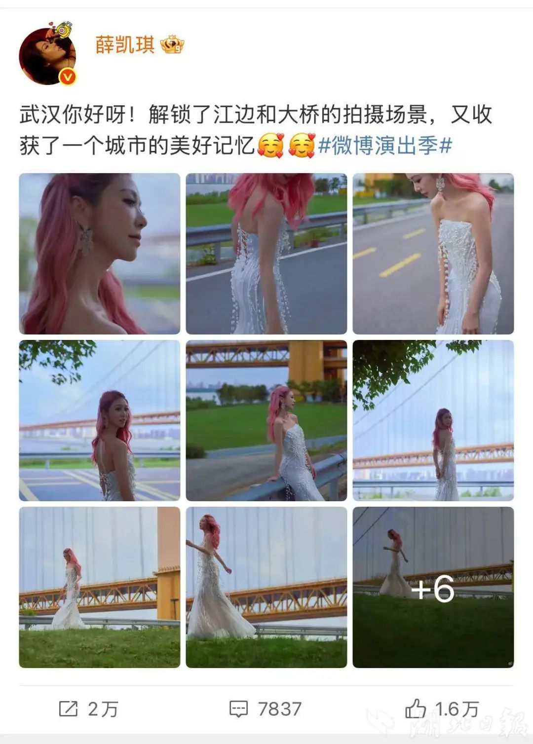 就在本周三(12号),任贤齐现身汉阳桥头,徒步横跨约4公里的杨泗港长江大桥,并在微博分享了沿途的壮阔江景。今年7月,艺人薛凯琪专程前往杨泗港长江大桥汉阳桥头下拍摄了一组惊艳大片。