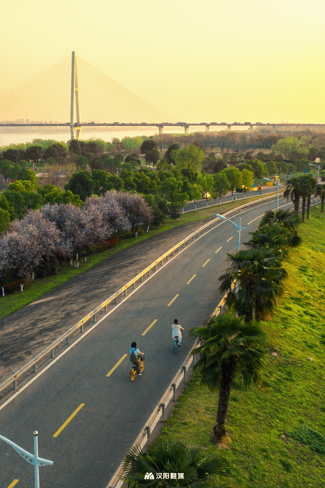 网红桥「杨泗港长江大桥」,更是许多人争相打卡的新地标。二层靠江的围栏刷成“柠檬黄”,靠车道的栏杆身披“野草绿”,日落时分万物自带滤镜,余晖给大桥、江水和一切都覆上一层金黄,怎么拍都好看。