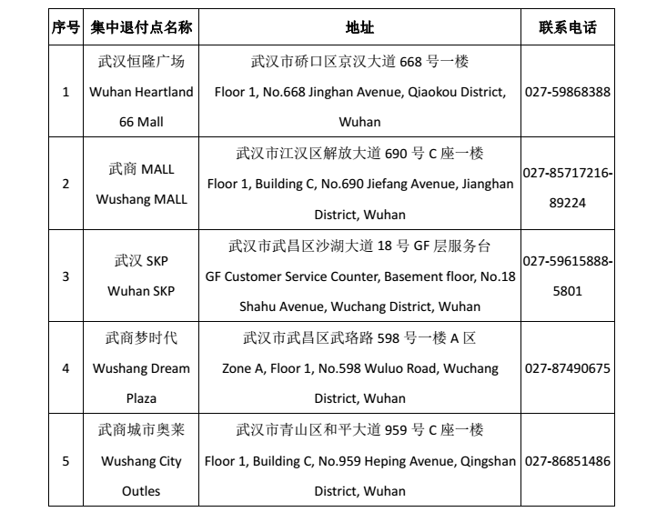 武汉市有5家高端商场成为“即买即退”集中退付点,分别为硚口区武汉恒隆广场(Wuhan Heartland 66 Mall)、江汉区武商Mall(Wushang MALL)、武昌区武汉SKP(Wuhan SKP)、武昌区武商梦时代(Wushang Dream Plaza)、青山区武商城市奥莱(Wushang City Outlets)。集中退付点支持受理全武汉市退税商店开具的退税申请单(包括一般退税商店、“即买即退”商店),为符合条件的旅客提供“即买即退”服务。换句话说,境外旅客在全市任何离境退税商店购物的商品,均可在5大退付点集中办理离境退税。