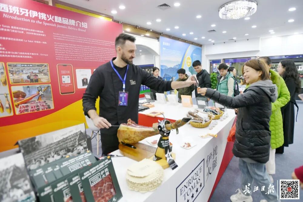 在主展馆内,西班牙火腿运营专家拉斐尔现场切片,将醇香的火腿分发给观众品尝。此次参展他带来了多款西班牙特色产品,包括一条腌制三年以上的黑标火腿,以及巧克力、杏仁糖和葡萄酒等。拉斐尔对武汉及华中市场充满信心,认为汉交会为品牌提供了精准触达华中消费者的重要窗口。