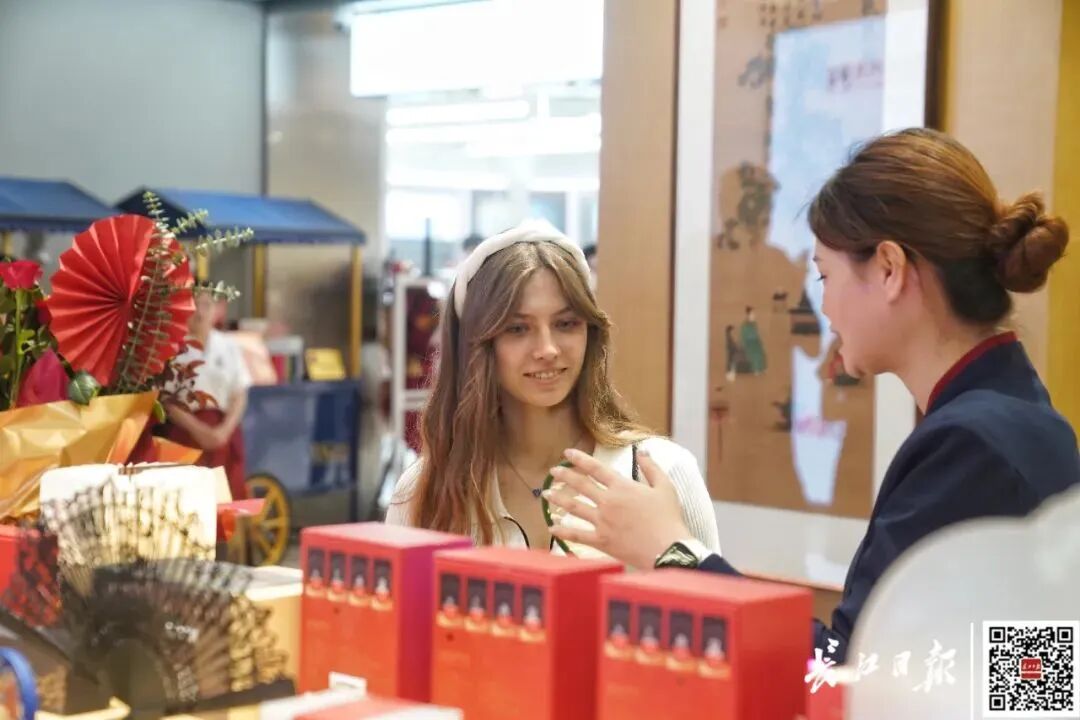 武汉首家市内免税店,店员为顾客介绍“武汉礼物”。肖僖 摄