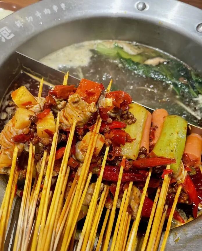 追求极致体验的食客,进门便会直奔鲜牛肉串串而去。新鲜牛肉穿成的串子,浸入那锅用泡菜发酵而成的秘制红油汤底中,酸爽的发酵滋味与猛烈的麻辣瞬间交织,激发出令人垂涎的复合香气。
