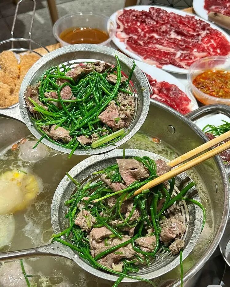牛肉新鲜现切,这是店家不变的坚持。每个部位的肉都拥有专属的涮烫时间,而其中最经典的莫过于8秒定律——只需在清汤中轻涮8秒,肉片瞬间蜷缩变色,入口便是极致的Q弹与鲜嫩。无需任何蘸料佐饰,空口吃就能感受到那股纯粹而浓郁的肉香在口中化开。