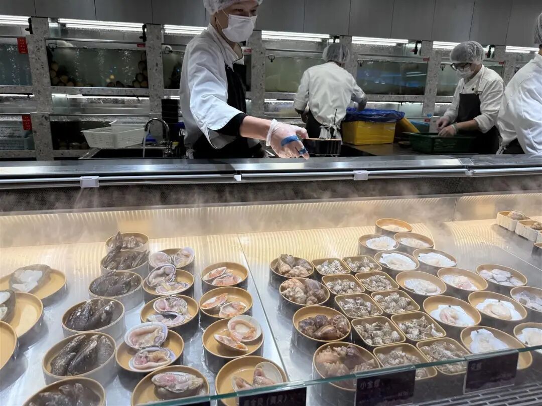 “这种边逛边选的模式太有意思了,能看到食材从处理到上桌的全过程,吃得也更放心。”刚下班过来尝鲜的市民王女士,推着手推车,在不同档口间自主挑选。很快,她的推车里便摆满了大闸蟹、刺身、牛羊肉等食材。