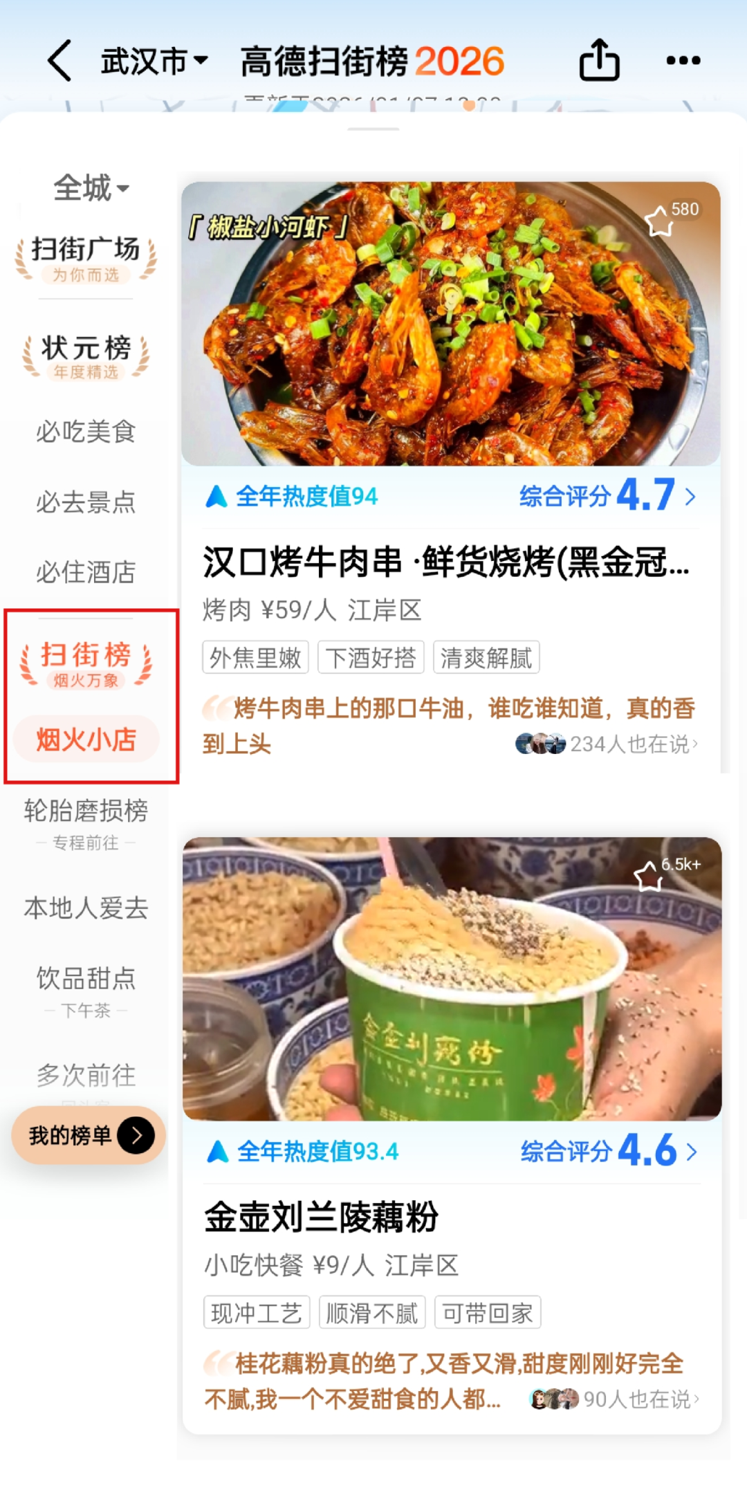 肥肥虾庄市场总监感触很深:“作为武汉本土品牌,本地居民对我们非常熟悉,但很多外地游客不了解。自从上了高德扫街榜后,游客增长量更多了,因为他们知道榜单数据是无数顾客真实打卡、真心推荐的。”