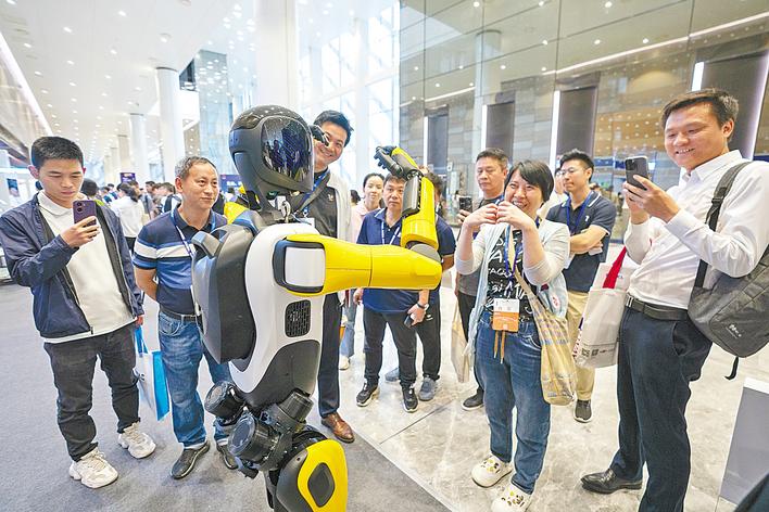 第二十届“中国光谷”国际光电子博览会,人形机器人在现场与观众互动。 (湖北日报全媒记者 魏铼 摄)