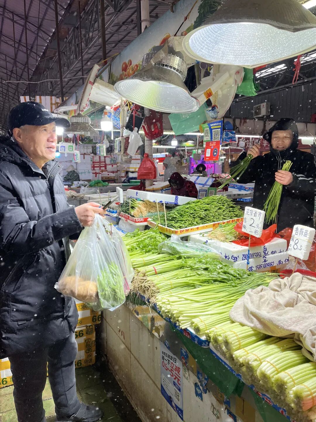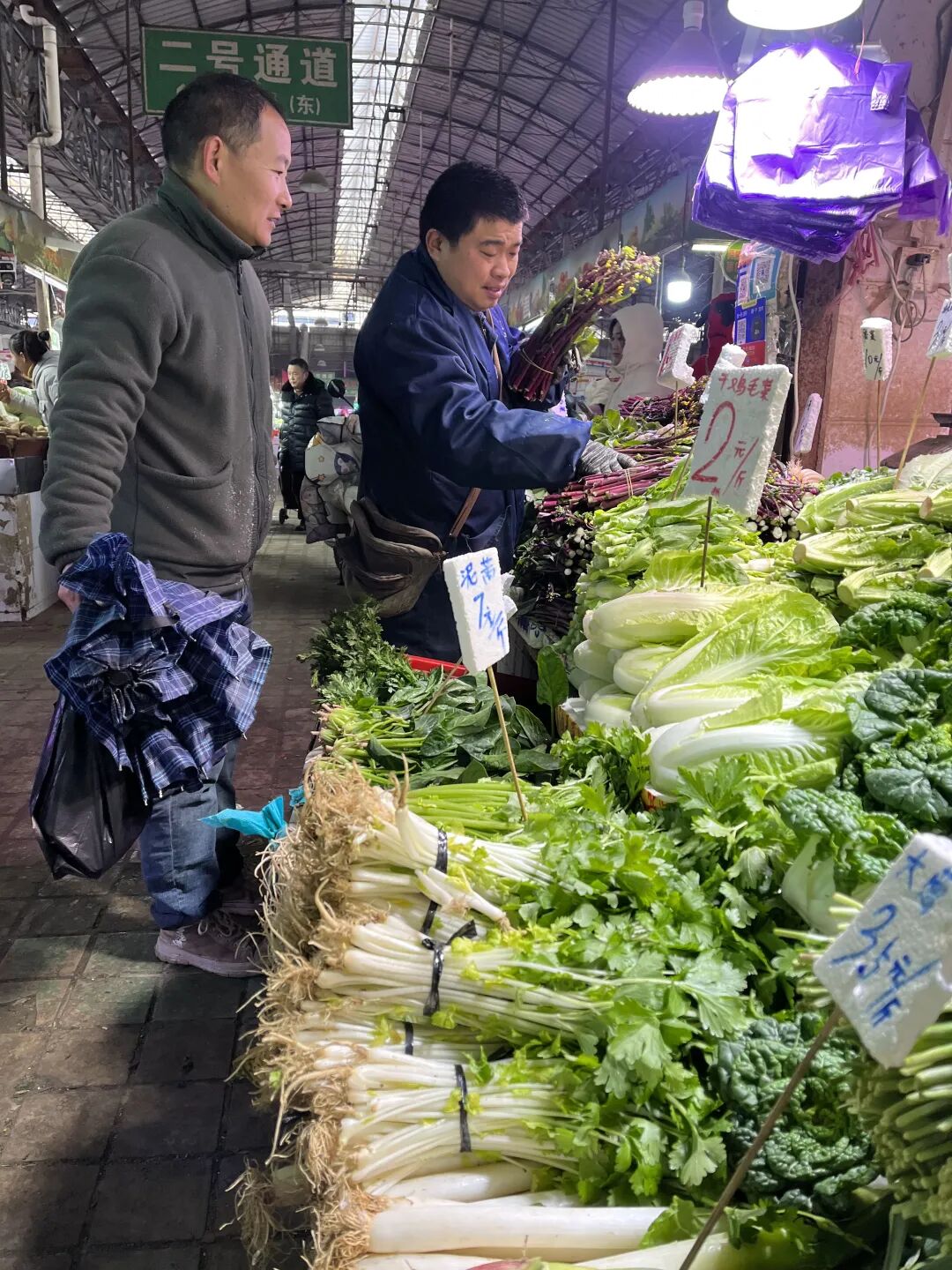 市场里,各个摊位档口前的人流量并不多,与平常的热闹情况形成了反差。在“李姑娘蔬菜批发档口”,店主孟亮笑着介绍,他家的香芹和蒜苗价格和昨天相比没有变化,一是因为昨天进货价没涨,二是因为今天客流本来就少,涨价了会更难卖掉,“感觉客流少了一大半,但也可以理解,很多市民都因为天气预报提前备了菜”。市民陈爷爷来到该档口,4元钱买了两把香芹,“我住的近,没怎么备菜,今天特意到菜市场买烤馍过早,顺便把菜给买了”。