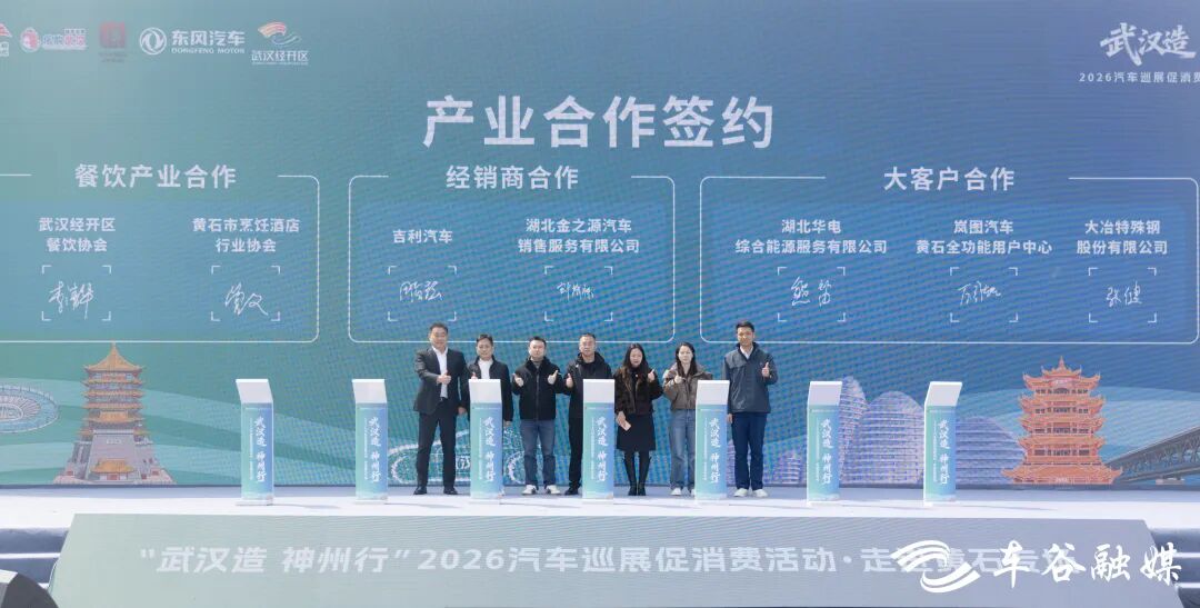 东风汽车公司产业协作办公室与黄石威顺机电有限公司签订合作协议,共建东风汽车商城。中国车谷品牌运营中心分别与黄石耀元汽车销售服务有限公司、黄石恒信德龙汽车销售服务有限公司、黄石鼎智汽车销售服务有限公司签订合作协议。吉利汽车与湖北金之源汽车销售服务有限公司,岚图汽车黄石全功能用户中心与湖北华电综合能源服务有限公司、大冶特殊钢股份有限公司,武汉经开区餐饮协会与黄石市烹饪酒店行业协会分别签订产业合作协议。此次签约,有力推动武汉黄石两地产业链深度对接,将助力两地共促消费、共兴产业。