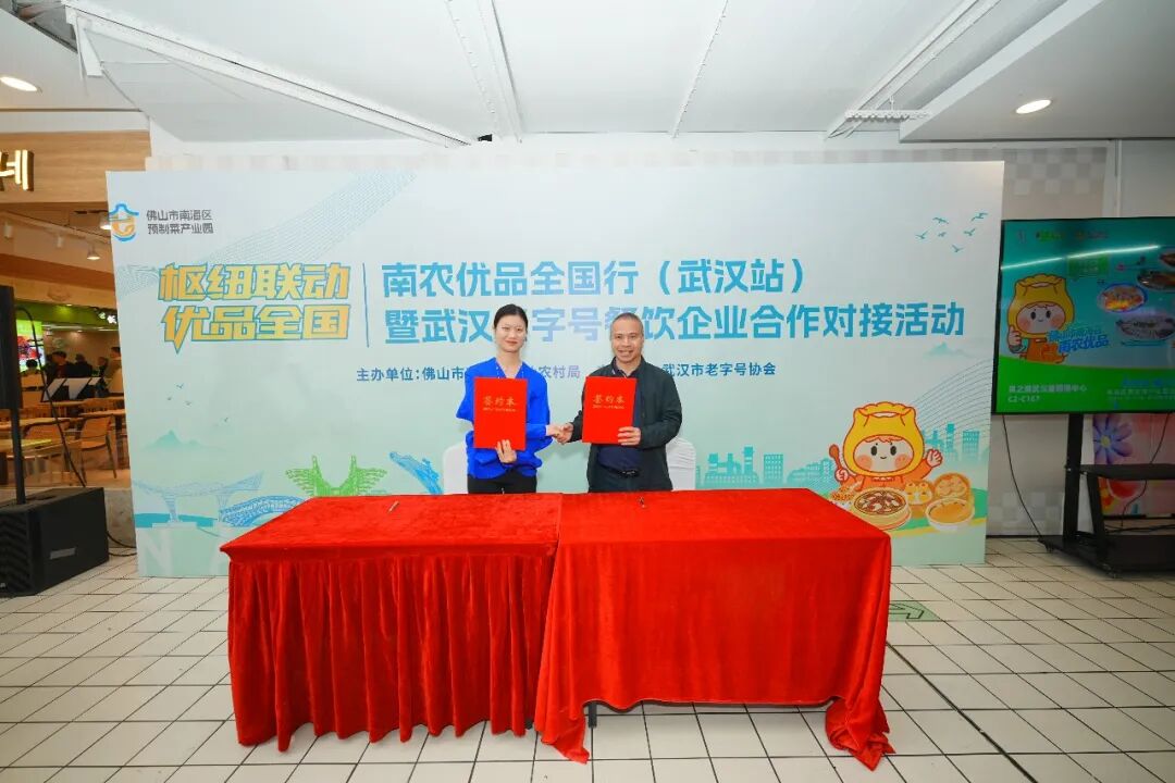 产销对接合作签约仪式同步举行,南海区农业农村局与武汉市老字号协会现场签署合作协议,双方达成深度合作共识,未来将实现资源共享、优势互补。