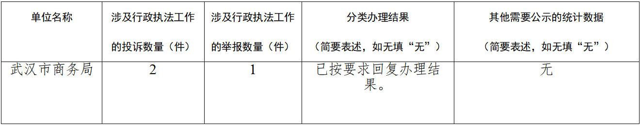 本单位受理或其他单位转办的涉及行政执法工作的投诉、举报案件的数量及分类办理结果,及其他需要公示的统计数据。